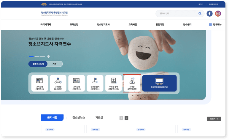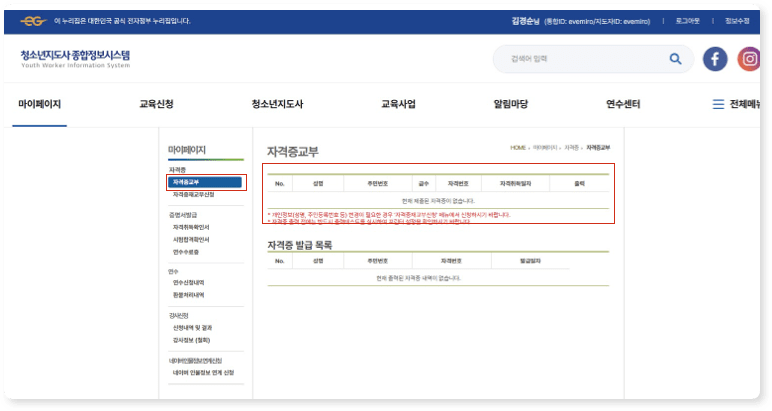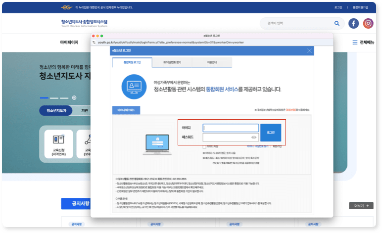 Step 01. 청소년지도사 종합정보시스템 접속 및 로그인 (https://www.youth.go.kr/yworker/usr/index.do)