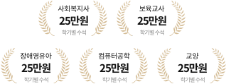 사회복지사, 보육교사, 장애영유아, 컴퓨터공학, 교양 각 전공 내 가장 성적이 우수한 수석 장학생 선발